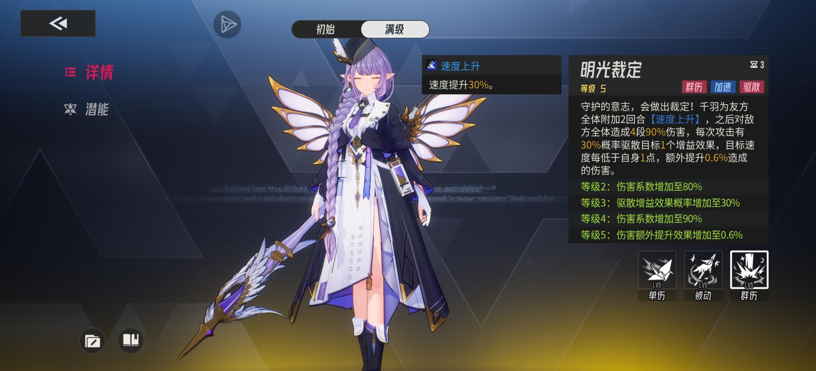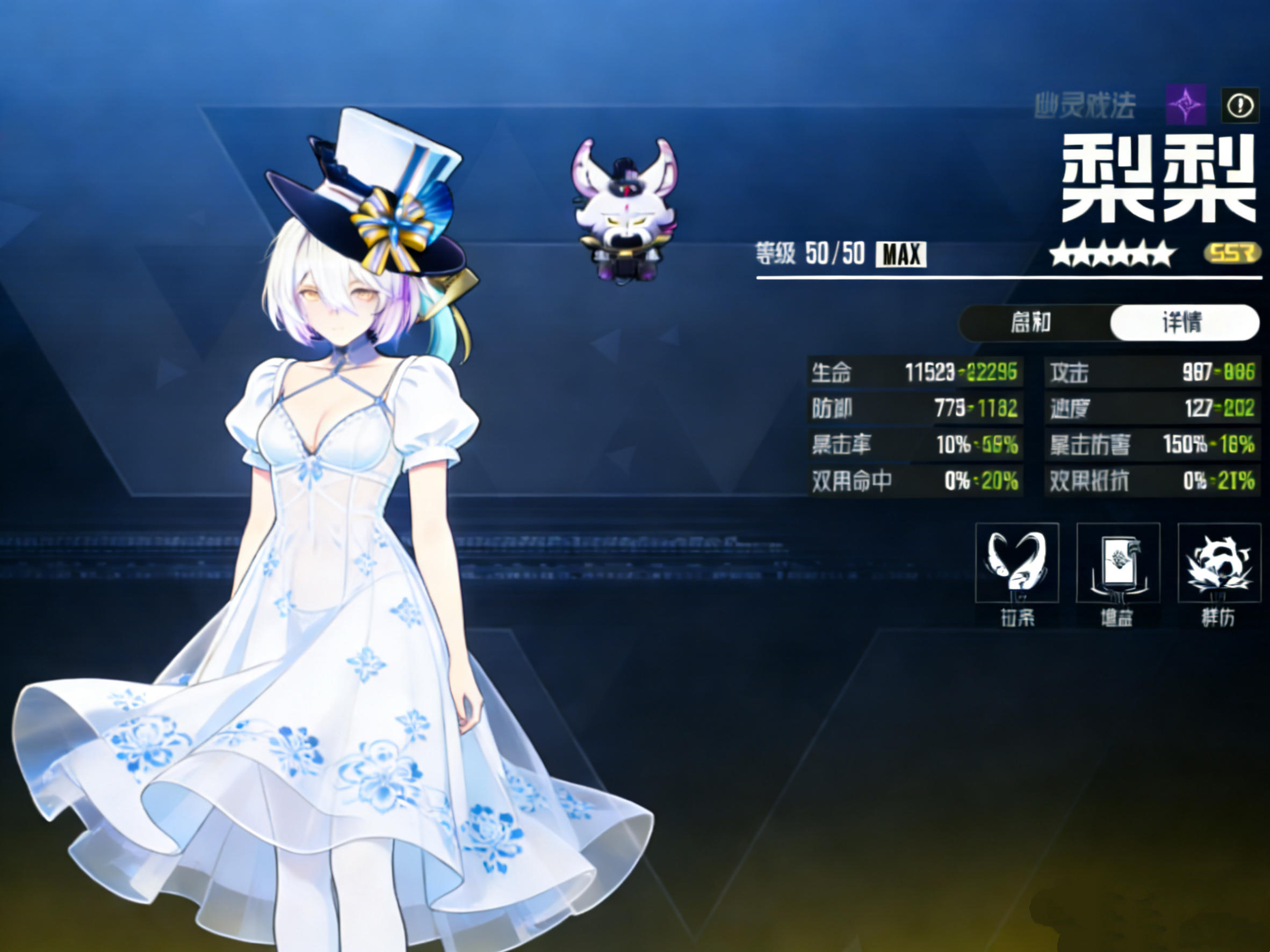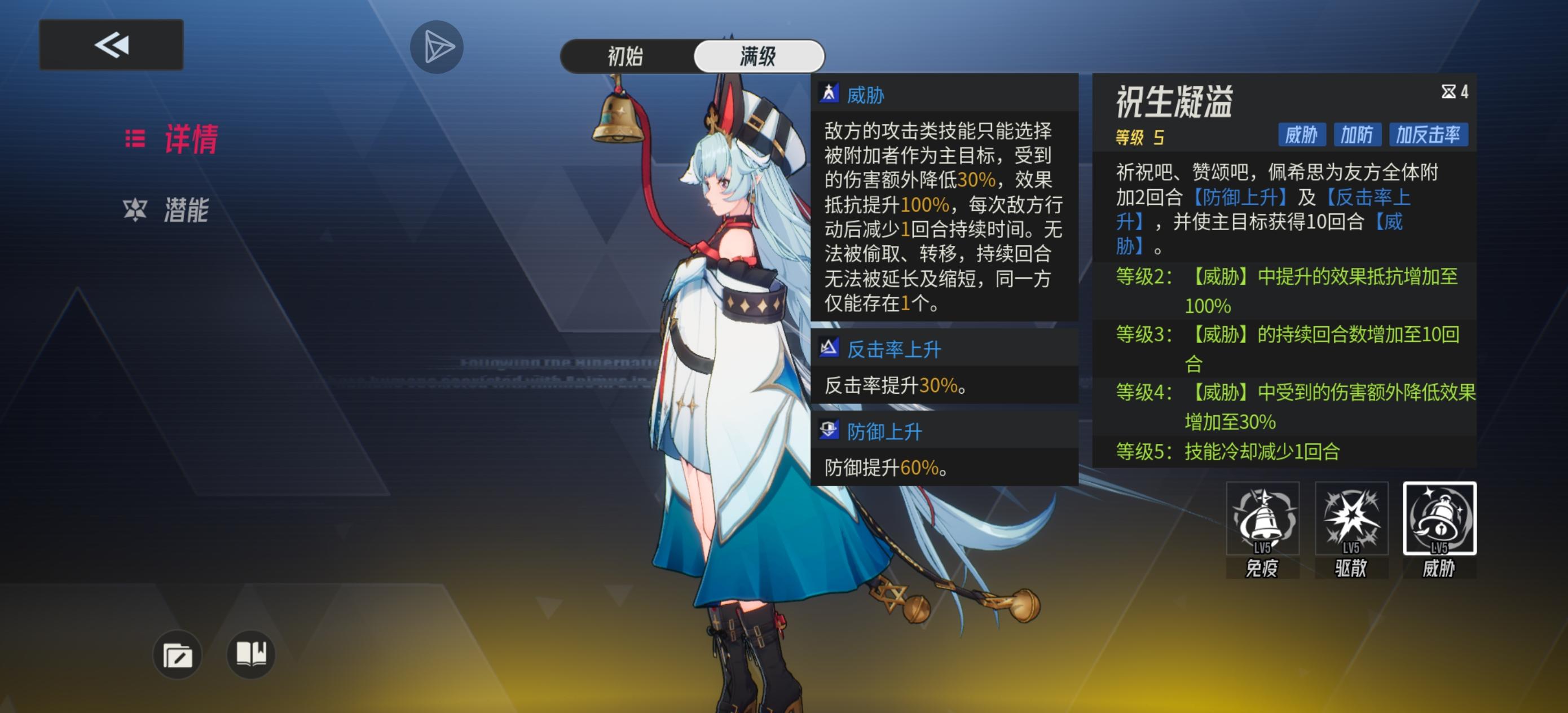 大招高达八回合威胁,20%减伤,满级大招30%减伤。二技能驱散并附加易伤。一技能点满,常驻免疫。本体也有不错的高概率,可以配合防御带荆棘的角色,这样防御角色也可以在活动本有不错的出场率,相当于水系版另类的罗魍, Pvp由于可以被驱散,所以要注意ba位或者队伍的搭配#伊瑟 #伊瑟ss2赛季