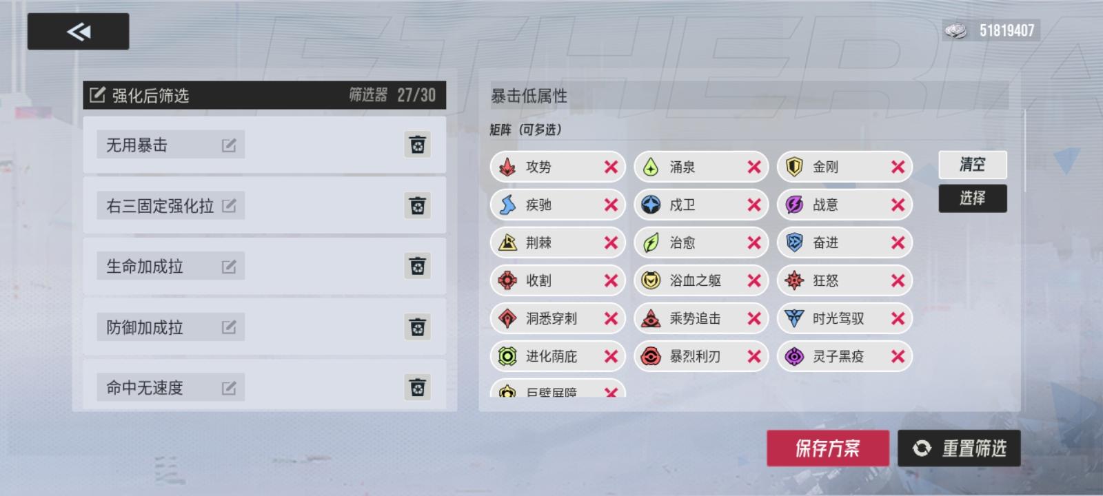 02bS7EQx5原则是固定属性和效果抵抗低人一等,没有暴击的必须有速度没有速度的必须有暴击。部分类型必须有速度或必须有暴击,单纯加伤害的类型右三只留三维百分比和暴击爆伤。注意因为爆伤用的非常多所以有些属性不行的爆伤不得不用,觉得要用的爆伤被回收了可以在第二个里面调整。注意还在凑合用的时尚小垃圾最好上个锁