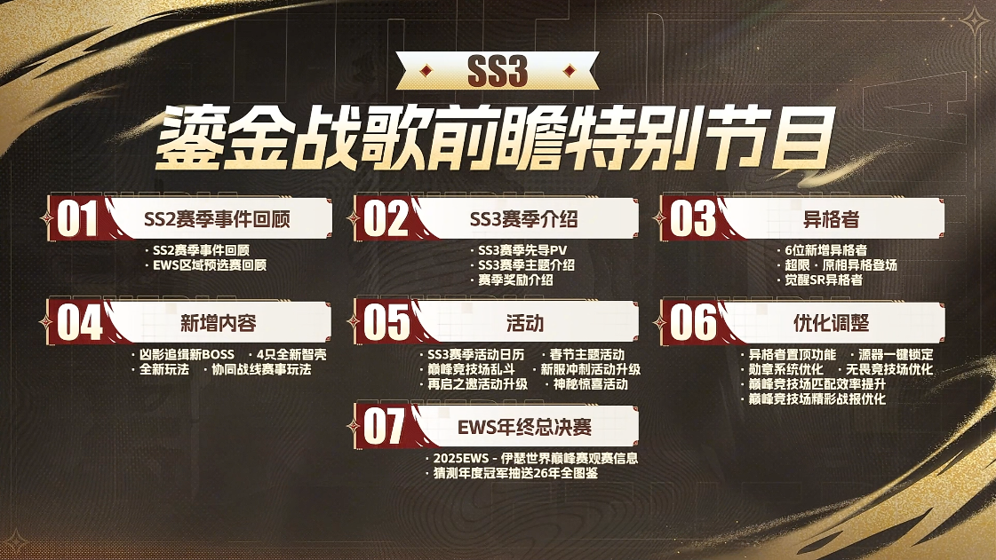 SS3赛季前瞻特别节目圆满结束,感谢超链者的观看和支持!为庆祝SS3赛季鎏金战歌盛大开启,赛季签到第一天即可获得【超限原型*10】!✨关注游戏《伊瑟》并在下方留言,我们将在2月14日0:00抽取10位超链者送出【异格者第二弹周边礼包(随机徽章*1+随机立牌*1)】▼点击下方视频即可查看前瞻特别节目回放。▼点击下方长图即可查阅前瞻内容总结。#伊瑟
