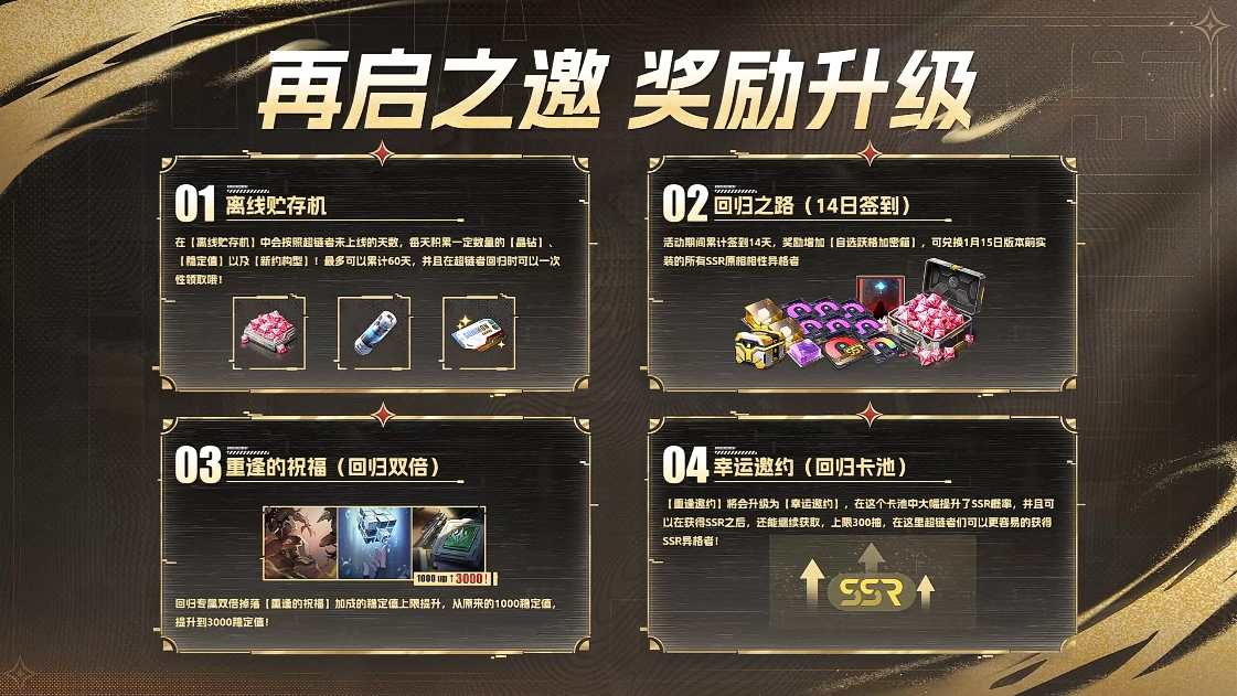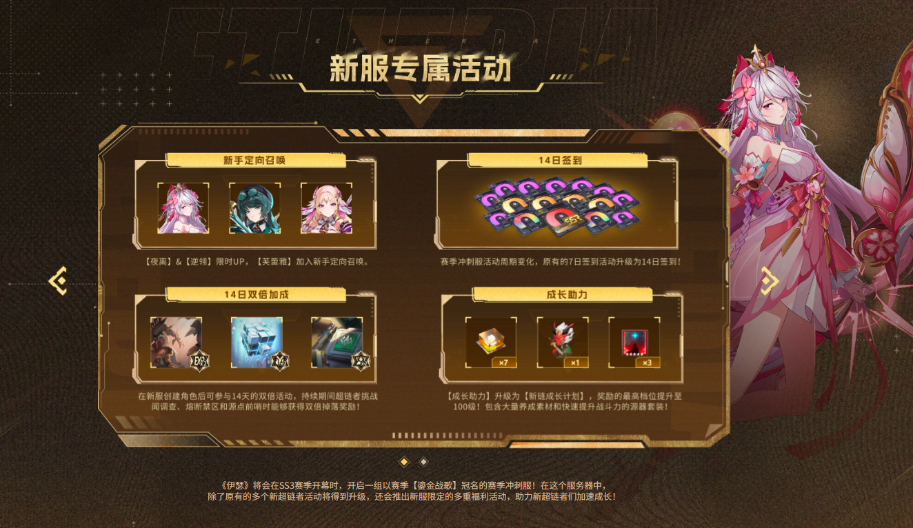 SS3全新赛季即将开启,冲刺服预约正式上线,2月5日新赛季,玩冲刺服,加速养成,全面护航!◆养成加速!全新赛季冲刺服新创角色享受14日掉落翻倍加成。◆福利加码!冲刺服特别活动,送养成资源,全套源器,开局不卡,全面护航!◆鎏金镀身!特训活动开启,制霸全服,领专属奖励!还有黄金相送!※特训活动结束后,排名第一的超链者将会收到黄金制作的ID名牌,具体内容请等待后续官方公告。2月5日,全新赛季新