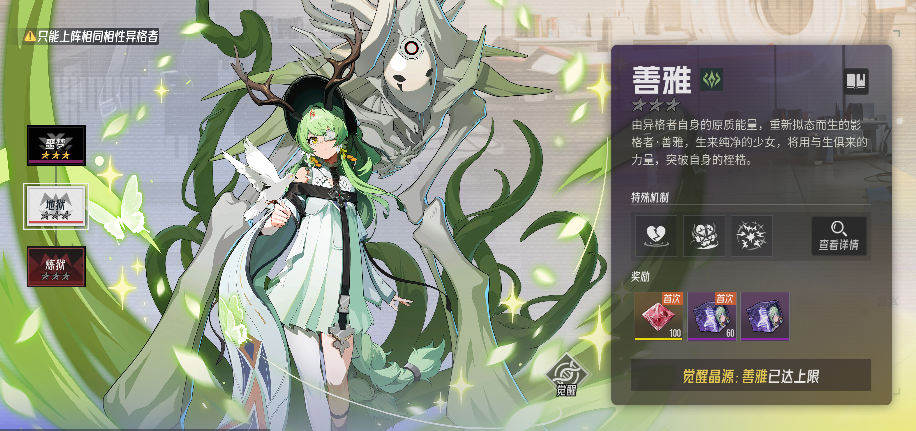 情况是我没有善雅,打了一次普通的善雅觉醒本,然后地狱就不让打了。今天抽到善雅后情况也没有改变,目前只有14个觉醒材料但是提示我已满没法刷善雅觉醒材料了!