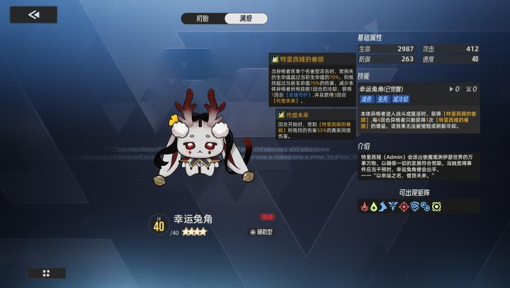 智壳名字:幸运兔角智壳介绍:特里西娅(Admin)会派出使魔观测伊瑟世界的万事万物,以确保一切的发展符合预期。当她觉得事件应当干预时,幸运兔角便会出手。一一“以幸运之名,借贷未来。” 智壳类型:辅助型 基础属性:生命2987,攻击412,防御263,速度40。 可能出现的矩阵:攻势、涌泉、疾驰、时光驾驭、奋进、收割、极影强袭、进化荫庇。 智壳技能:生效延迟回合:0,智壳冷却:0。本