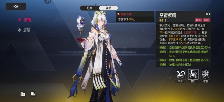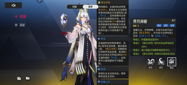 很强,自带一个时光。加三个增益buff,70%/100% 的大招概率,大招不升满的话,运气好,三回合能释放一次,叠满大招,两回合释放一次。有80%防御的护盾值,还可以上两个负面buff,外加普攻增伤初始25%/40%和二技能增伤初始30%/50%。是个后手增益的防御出伤c,能保人,有伤害。无论是pvp还是pve都可以有不错的出场率。