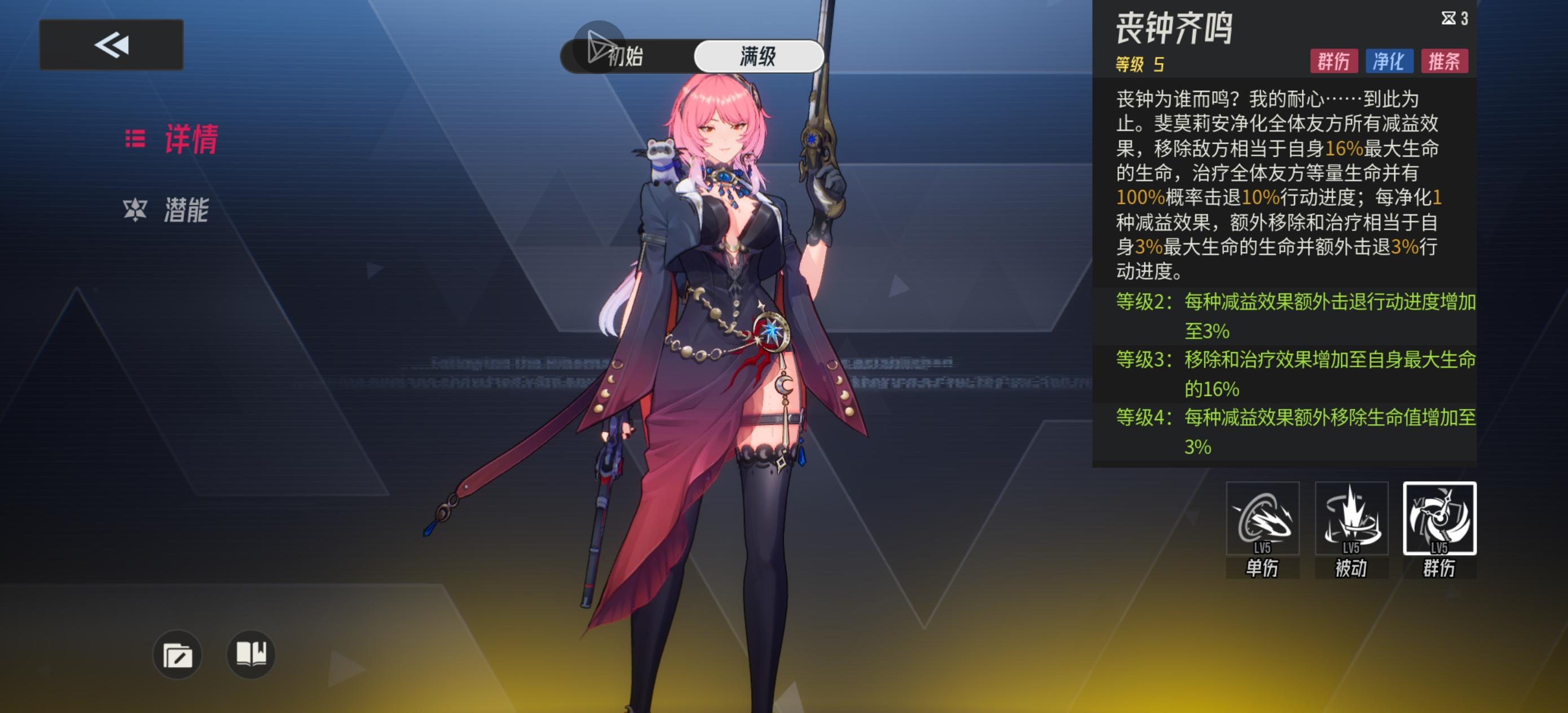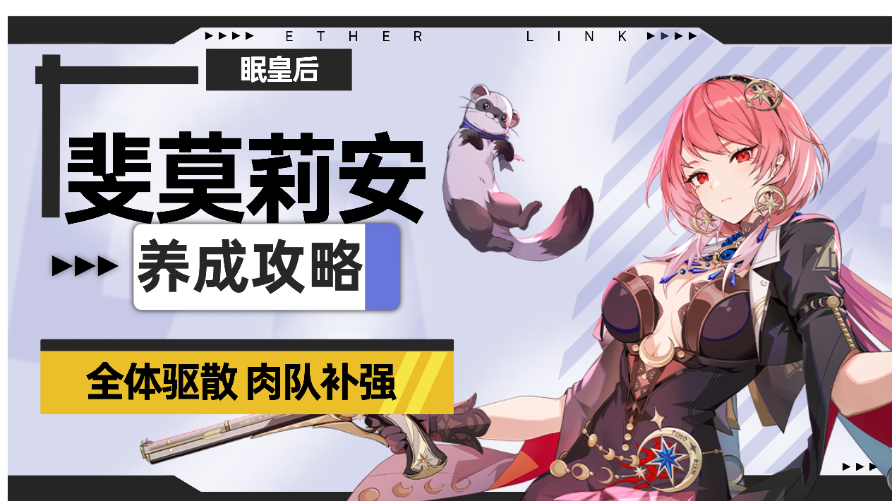 【斐莫莉安】排名第二的海德拉银行十大经理人,追债人的领袖。为人低调,不在意名望和攻绩一级收债人,像影子一样。。。总让人觉得如芒在背,如临深渊。🌟技能加点推荐起用:115 S3潜能中有重要的15%生命加成,S3满级可净化全部减益效果完全体: 155S2潜能有着类同瑞玛丽被动的效果,可降低触发条件要求终极体:555S1潜能未附加可净化减益效果友方提升行动进度由6%--9%--1