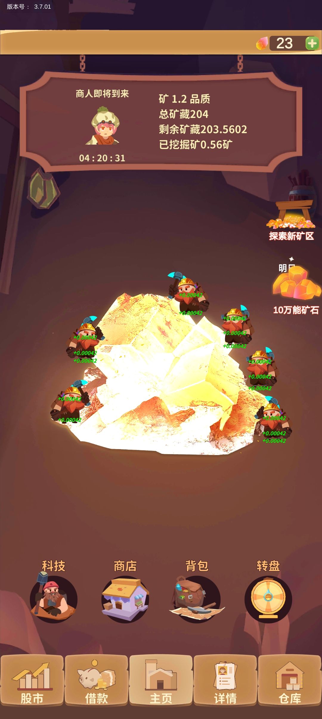 矿区图长这样 首先是石头的获得,目前有几种途径获得万能石。第一种,是矿区的自动挖取。自动挖取的速度与矿的品质有关。目前所看到最高的品质是1.2,出现概率也大。第二种是看广告。第三种是提交宝石获取。第四种是换矿区获取。换矿区获得的石头与该矿区开发程度成反比例关系,剩余矿藏越少则前往新矿区获得石头越多。因此每天看广告之前都可以先将矿区的总矿藏刷低再看广告以获得最大收入。第五种是转盘获取。第六种是游戏世