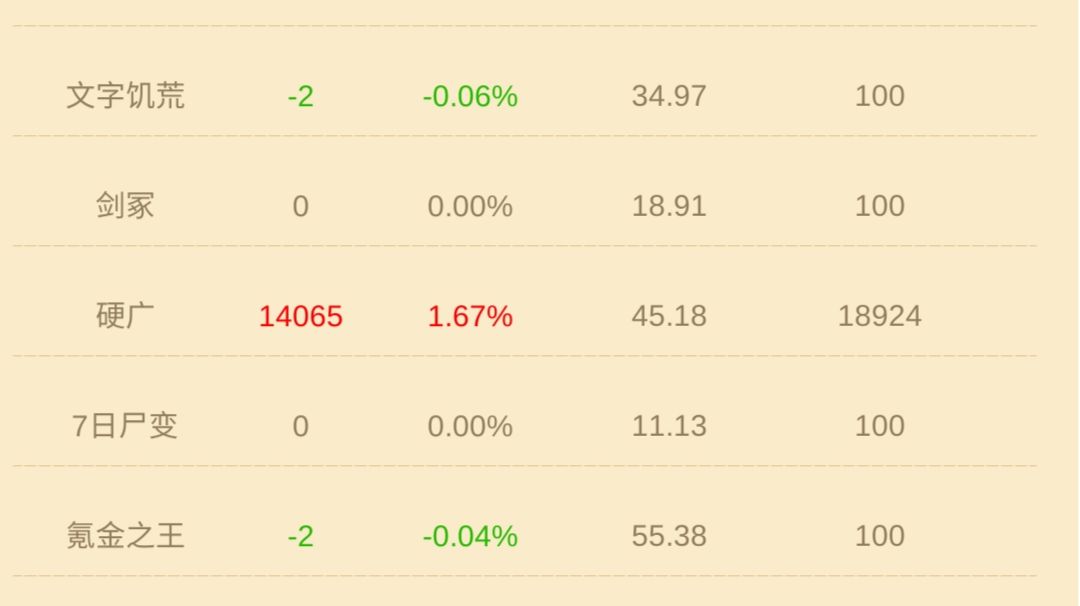 《氪金之王》这款游戏中有不少可圈可点的内容,但要说最让玩家上瘾和头疼的地方,那肯定莫过于炒股啦!你还在为不知道怎样炒股赚钱发愁吗?看完这篇文章保证你豁然开朗! 我们先看一下我现在截的这张当日价格涨跌幅度图 炒股的原理不用我多说(单指这款游戏),无非是看见哪支股票涨了马上跟投,涨停后再立刻抛出,但眼睛盯着这张当日涨幅图,我相信很多小伙伴都是一脸懵吧?那有没有更直观的方式来观察某支股票的涨幅呢?