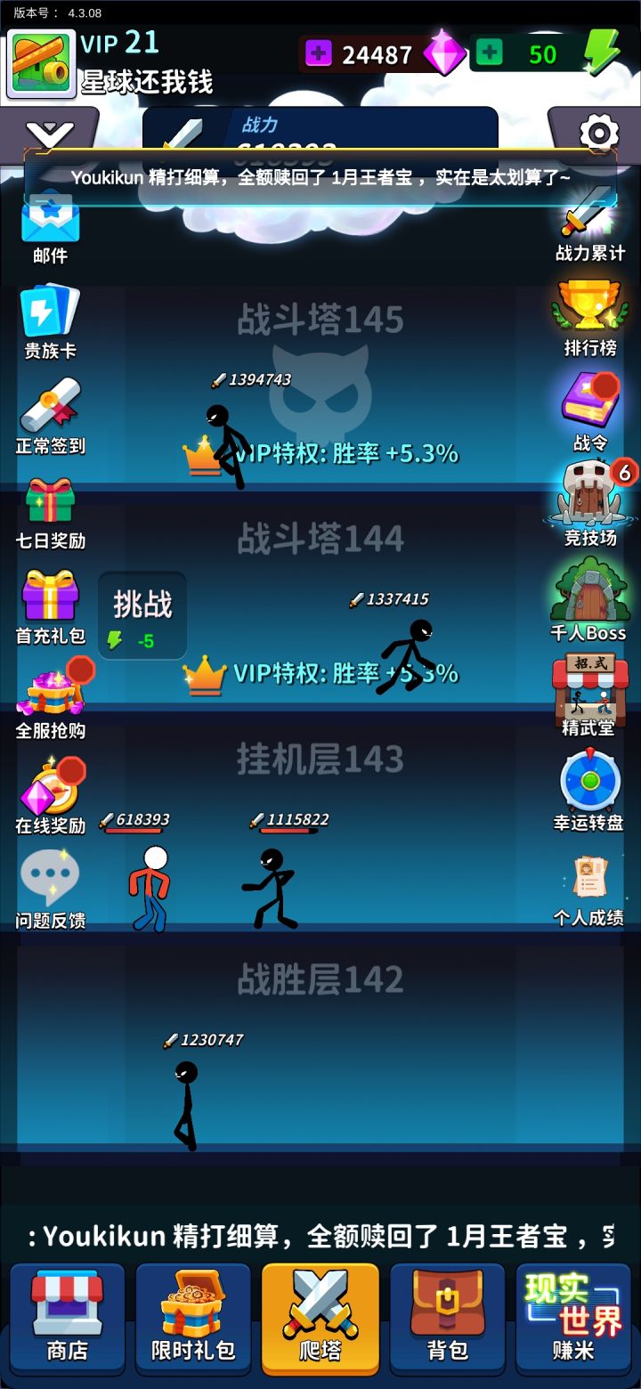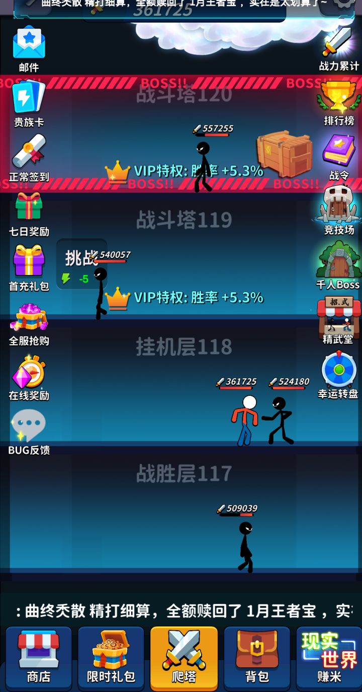 本游戏主要分为游戏与现实两个世界,基础逻辑是在现实世界赚钱,在游戏世界氪金,货币兑换关系是钞票(现实)→钻石(游戏)→战力(非货币),通常不可逆转,以下将分别阐述。游戏世界中间的爬塔是游戏资源链的最终归宿,在这个简单的游戏里,没有复杂的血量,攻击,防御,暴击,格挡,战力是衡量战斗水平的唯一决定因素,如果你的战力比怪高,必胜,如果战力比怪低,那么随着战力差距拉大,胜率会逐渐下滑,直至怪的战力是你