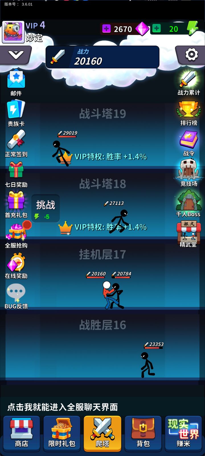本游戏主要分为游戏与现实两个世界,基础逻辑是在现实世界赚钱,在游戏世界氪金,货币兑换关系是钞票(现实)→钻石(游戏)→战力(非货币),通常不可逆转,以下将分别阐述。游戏世界中间的爬塔是游戏资源链的最终归宿,在这个简单的游戏里,没有复杂的血量,攻击,防御,暴击,格挡,战力是衡量战斗水平的唯一决定因素,如果你的战力比怪高,必胜,如果战力比怪低,那么随着战力差距拉大,胜率会逐渐下滑,直至怪的战力是你