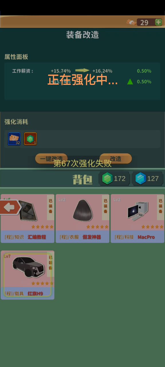 ①15级装备是0级装备属性的4倍②程序员0级套装汇编教程(知识)+604.8/-------假发(衣服) +6.05/+8.29%MacPro(科技) +6.05/+8.29%红旗H9(载具) ------/+8.37%(附图在文本最后)看帖指南:原帖第一段↑部分陈述+0级属性原贴第二段·看帖指南←—————————————————————原帖第三段↓直接结论————————