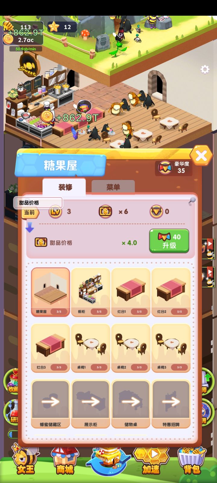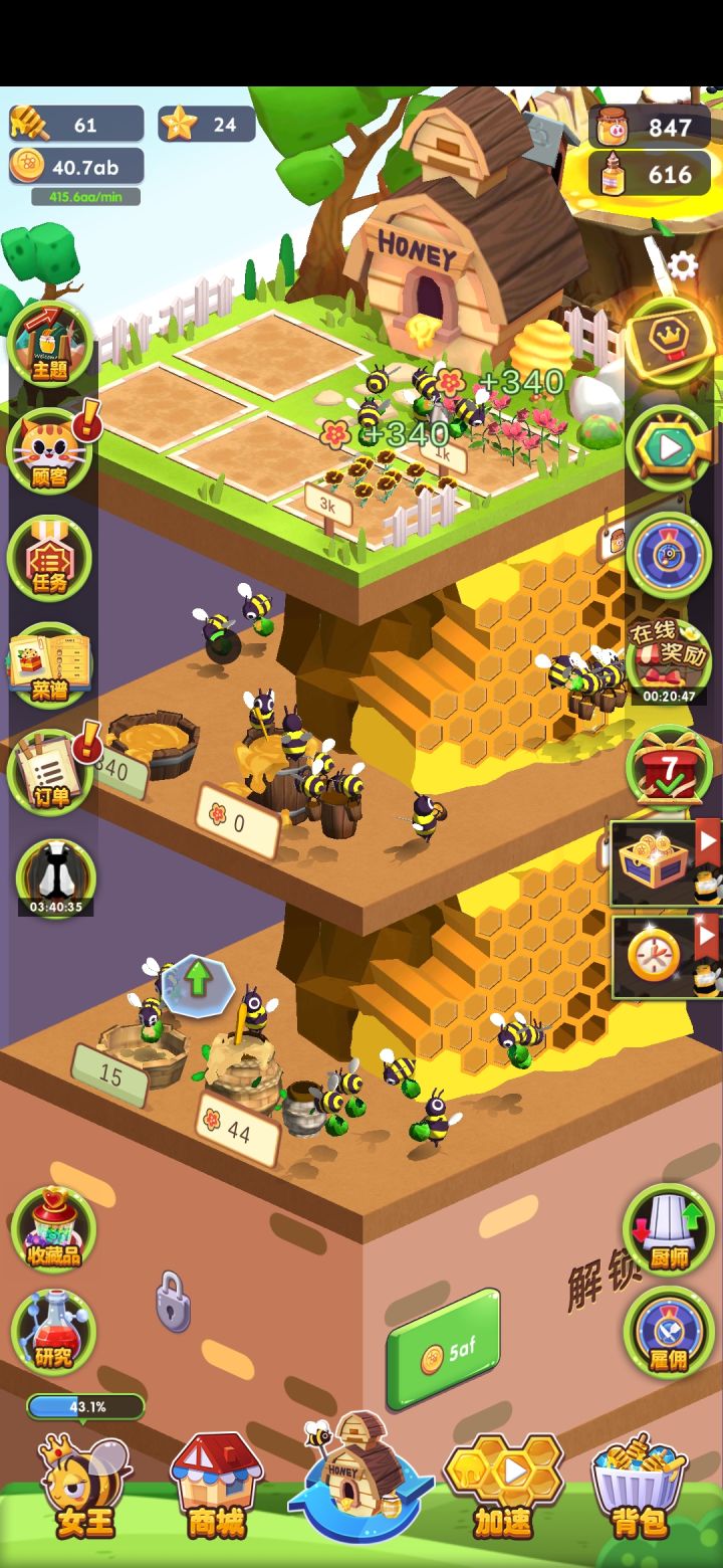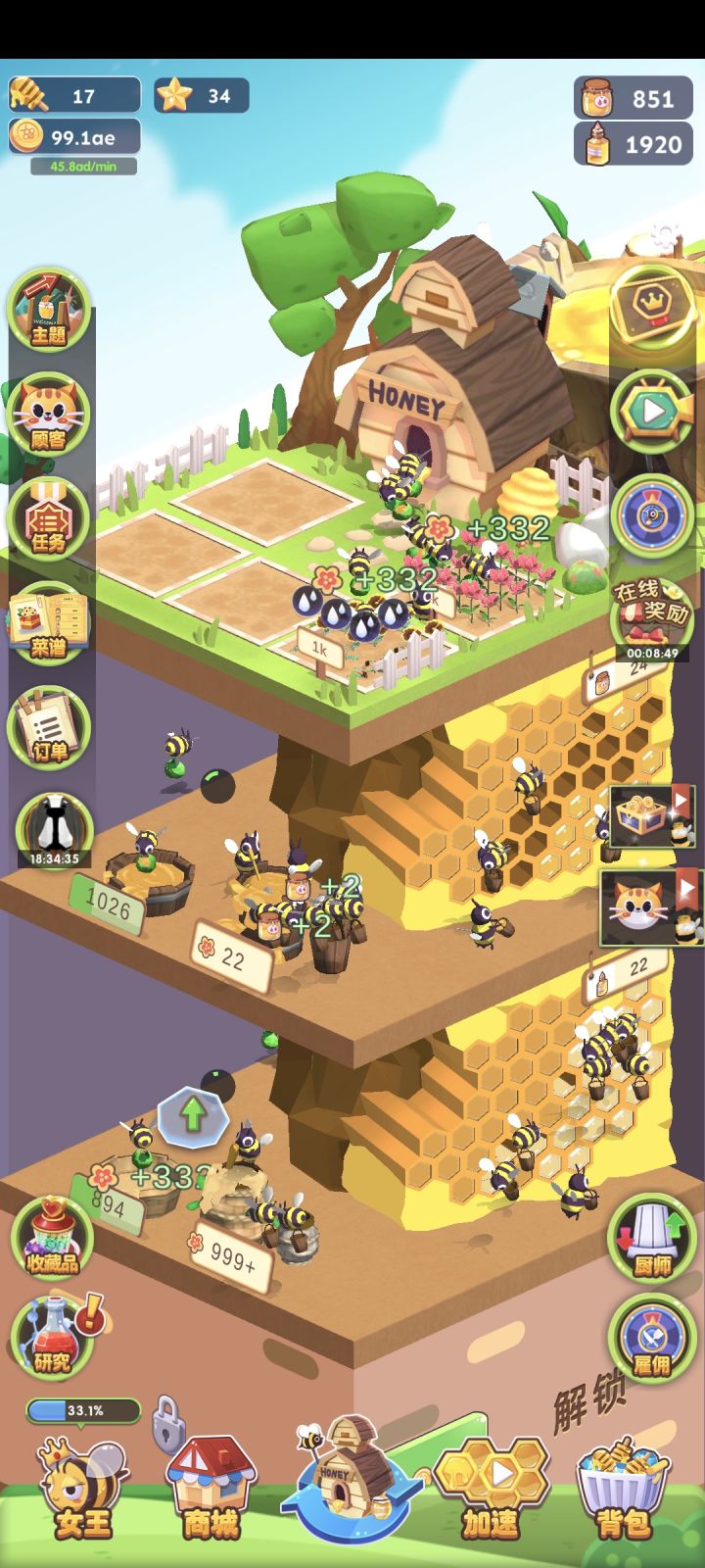 挺好玩的,无聊打发时间挺不错的前期保证蜂蜜跟上餐厅单子就赚钱了订单是可以制作多少份这很省事而且有的顾客会给一些碎片收集的一定要做有钱就升级蜂巢蜜蜂花圃速度餐厅、甜品蛋糕该升级的升级研究的别落下离线了也能赚不少