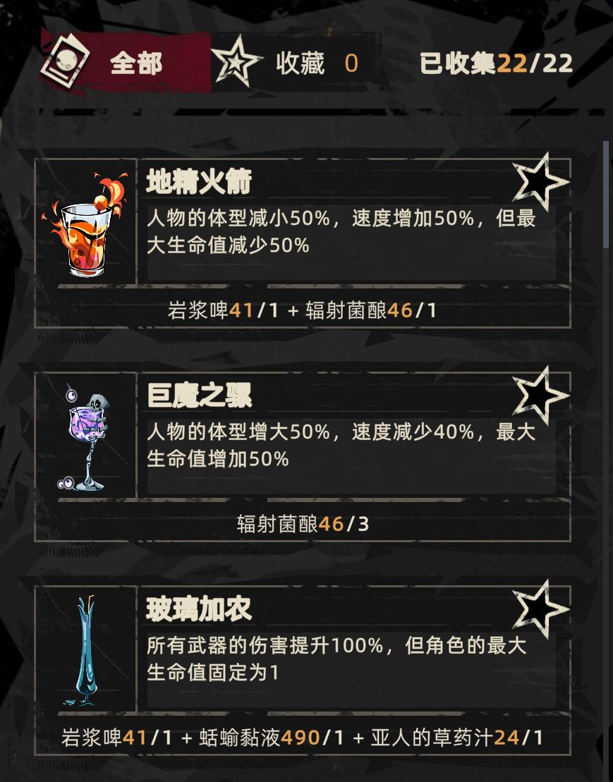 已知15种固定配方的饮品,欢迎大家补充,如有新增会进行更新。 除了有固定配方的饮品外,还有无固定配方的饮品目前已知至少有12种,靠免费调制和不是固定配方的材料随机合成出来,因不可控和实用性一般就不列出。 可以同时喝两种饮品,效果叠加。喝了第一杯饮品后在调制页面点额外调配可以通过观看广告再多喝一种饮品。 推荐使用怒火中烧+焦躁,单局可以达到8分钟左右,材料都在地狱表层,尽量做到材料循环。 注明两点: