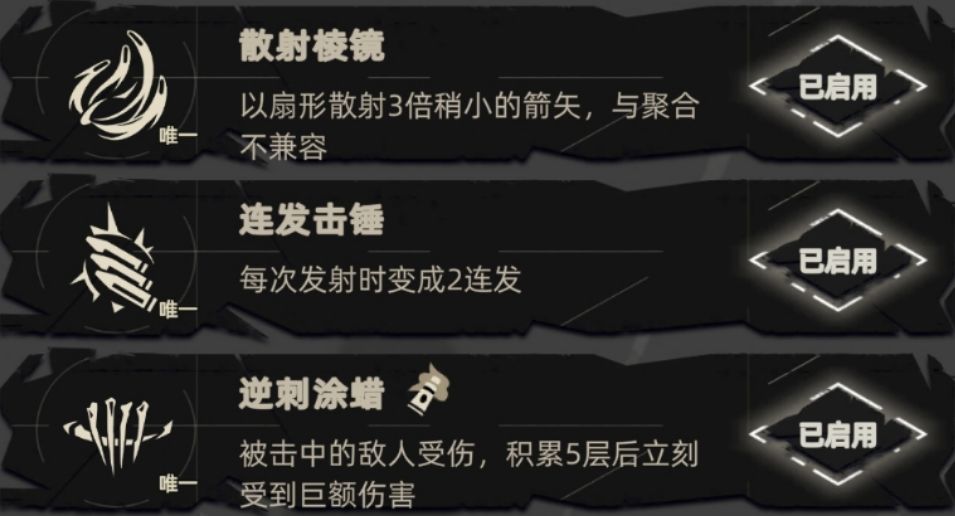 本帖子只以强度推荐。 不考虑混乱空间的速通排行榜和击杀排行榜。 等大家用熟悉了配件,祝福,自然就懂了。 下面推荐几个强度高的武器。(排名不分先后) 注:特别注意!配件如果出现这个标识,证明本颜色重塑的武器无效果。如下图,红色祝福重塑,本配件就不起作用。 特别注意!特别注意!特别注意! ①金弓箭(3个金色祝福重塑) 特色:射速快,频率高,还能帮忙吸经验金币。 核心配件推荐:散射,爆炸,二连射,反弹,