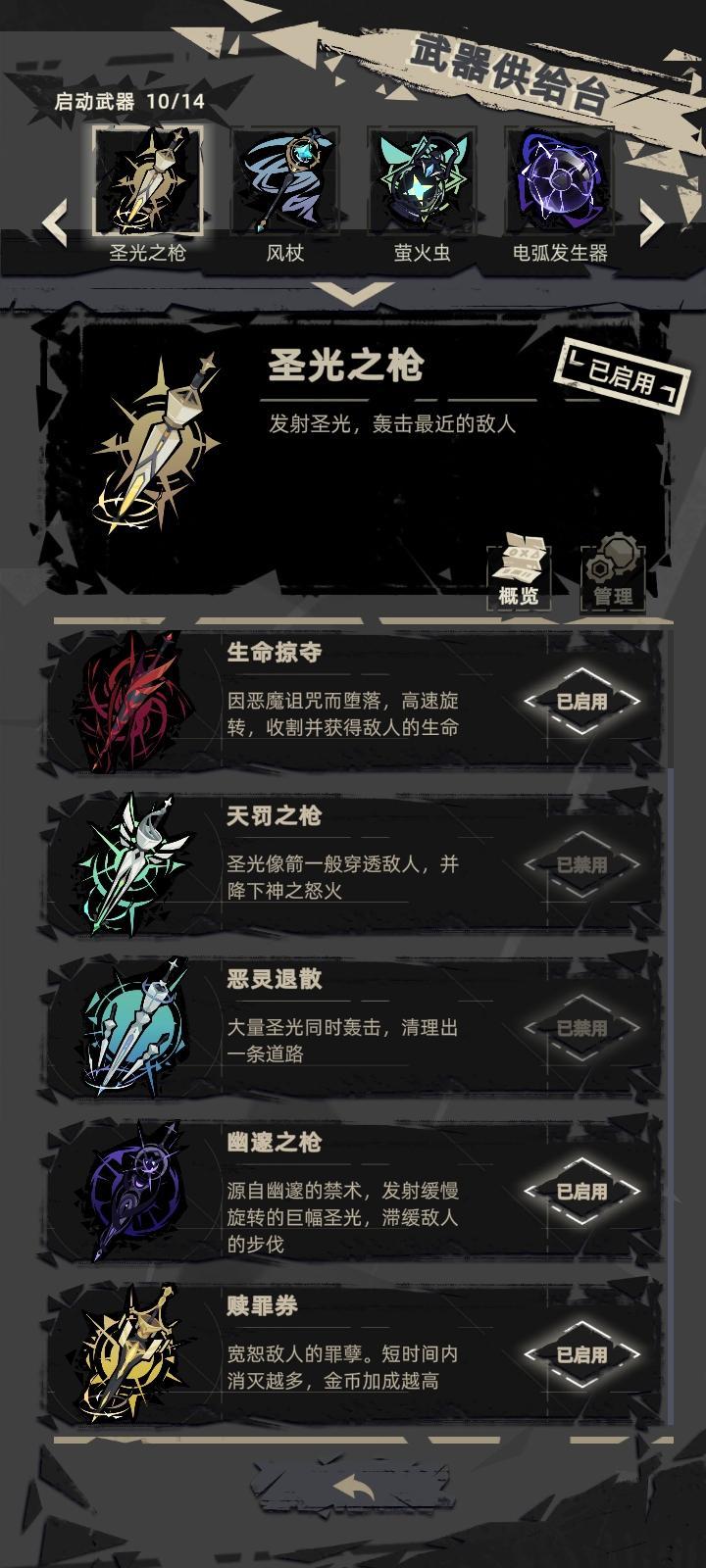 人物:天使长 武器:金圣光[固定] 金猫猫[固定] 金弓[可变] 金电[可变] 思路: 圣光保平安,猫猫打钱,两个可变位置击杀BOSS 打法: 1.给圣光选6词条(萌新千万不要选祝福,大手子随便,萌新就按我的步骤走) 2.捡箱子选出猫猫 3.给猫猫选满祝福和词条(祝福难选如果看到加金币的祝福先选金币祝福,三个祝福满了之后一定能选满完美词条) 4.重铸猫猫 5.给圣光及另外两把武器选金色词条 6.重