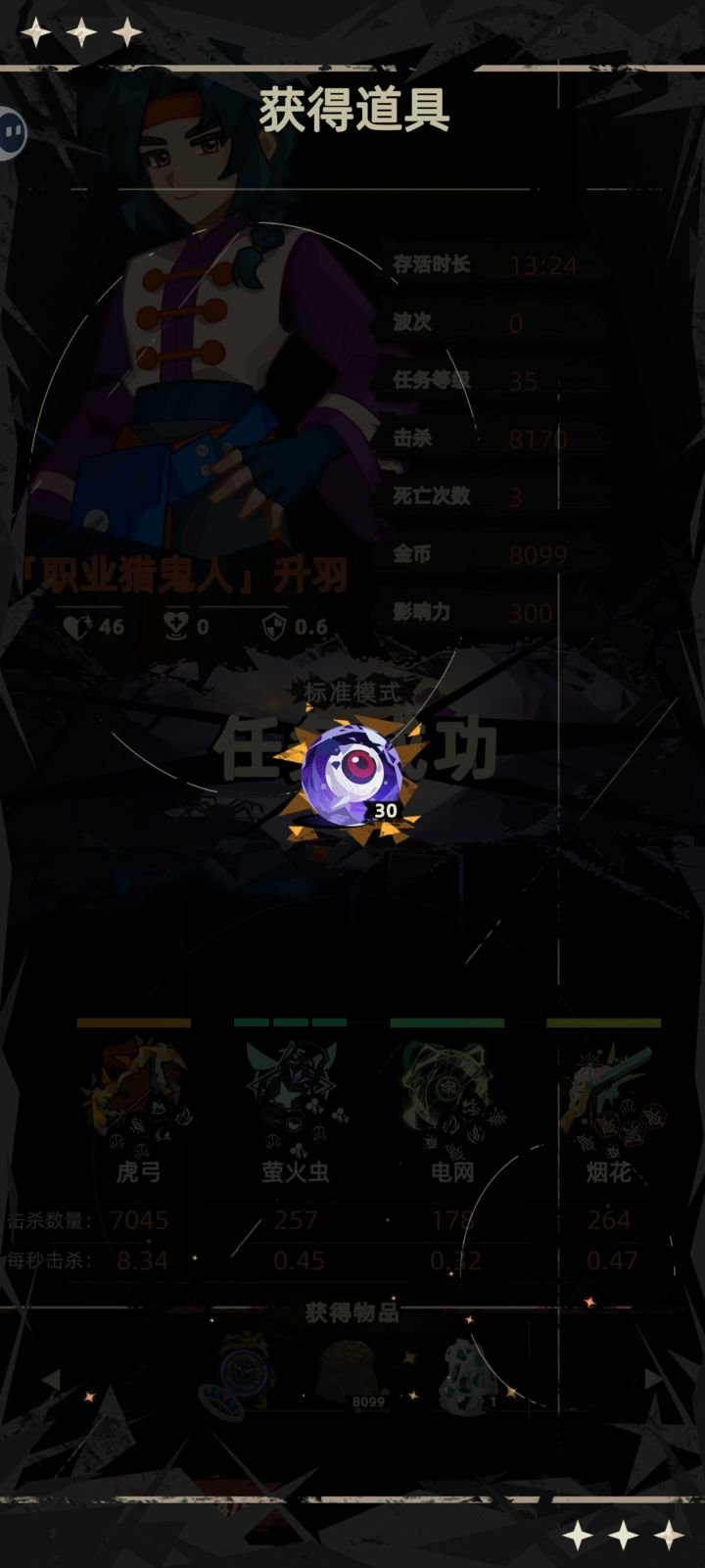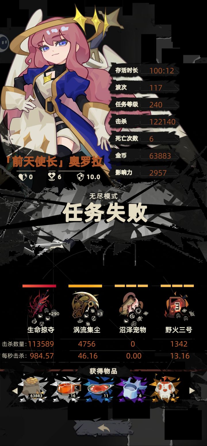 边看电视边玩,挂机挂了一百分钟才六万多金币,还不能双倍领取。花金币的地方太多,赚金币太慢了。前面怕伤害不够一直升主武器后面才拿其他武器就是为了要那个加金币的祝福,可是那个祝福根本没用,无尽模式的契约根本不吃金币加成。