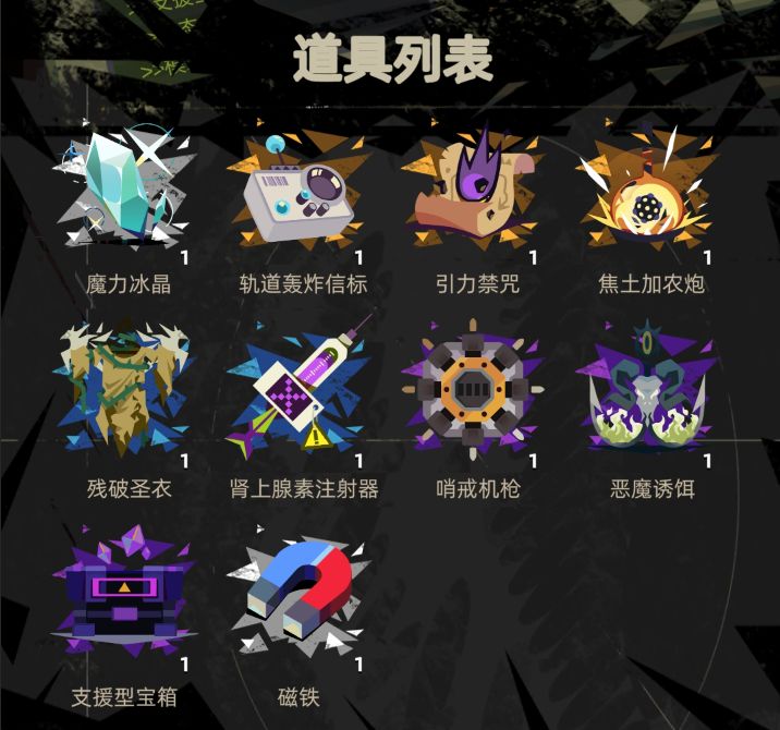 魔力水晶:冻结所有敌人7s轨道轰炸信标呼叫轨道轰炸,对所有敌人造成500伤害,并造成击退引力禁咒释放引力禁咒,拖拽行星环带中的陨石集群砸向地面,持续30s。陨石也会对角色造成伤害焦土加农炮准备2s过后,将对面前发射一枚【焦土弹】,对命中的敌人造成大量的伤害,并将在地面犁出一道灼热的鸿沟,敌人踏入时会受到伤害并且击退残破圣衣立即进入无敌状态,并增加自身100%的移速,持续8s肾上腺