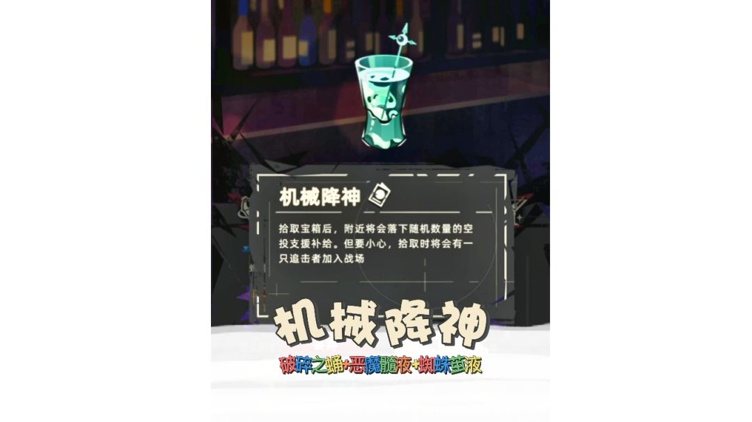 【调饮】【机械降神】 配方:破碎之蛹+恶魔髓夜+蚌蛛茧液 机械降神 拾取宝箱后,附近将会落下随机数量的空投支援补给。但要小心,拾取时将会有一只追击者加入战场 在饮品生效期间,将不可解锁成就(特殊相关成就除外),各项数据均不计入排行榜及统计 这个调饮可以刷金用