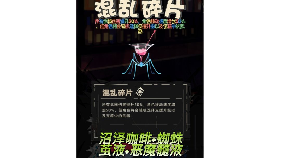【调饮】【混乱碎片】 配方:沼泽咖啡+蜘蛛茧液+恶魔髓液 混乱碎片 所有武器伤害提升50%,角色移动速度增加50%,但角色将会随机选择支援升级以及宝箱中的武器 在饮品生效期间,将不可解锁成就(特殊相关成就除外),各项数据均不计入排行榜及统计#攻略#游戏推荐#重返深渊#游戏安利