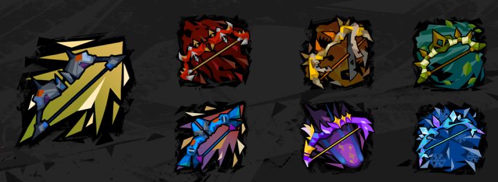 图中的武器依次为:无心弓(大图)第一排:狮心弓,虎弓,分形大弓第二排:驱魔连弓,落星大弓,凌之弓无心弓系列初始-无心弓:角色向行进方向发射无心之矢,对命中目标造成高额伤害进阶:驱魔连弓:角色向行进方向发射多枚驱魔之矢,对命中目标造成高额伤害狮心弓:角色向行进方向发射狮心之矢,对命中目标造成高额伤害。站立不动可以进行蓄力,向行进方向发射箭雨虎弓:角色向行进方向发射虎之矢,虎灵附着于