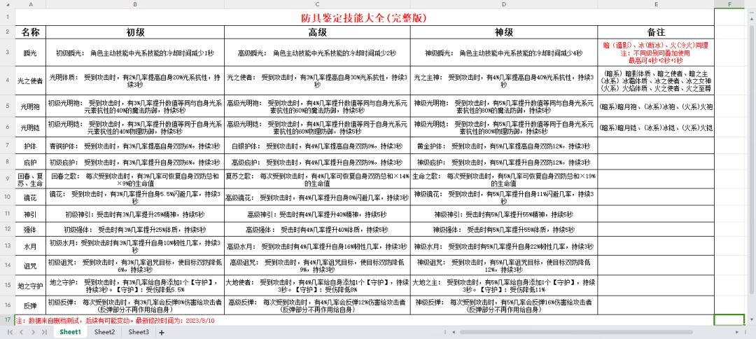 最新修改时间为:2023/8/10 1、防具鉴定技能大全 2、武器及首饰鉴定技能大全 所有鉴定技能同级别都不叠加(不管是防具武器首饰) 神+神+神(只生效一个神) 高+高+神(只生效一个高+神) 千万不要鉴定一模一样的技能!!! 重点说一下鉴定最多只能减去7秒的CD,要想减更多的cd需要靠装备的特殊效果 光系、无系(暂时没有) 暗系减2秒(法师30级橙头——暗域眼罩) 暗系减1.5秒(通用40级粉