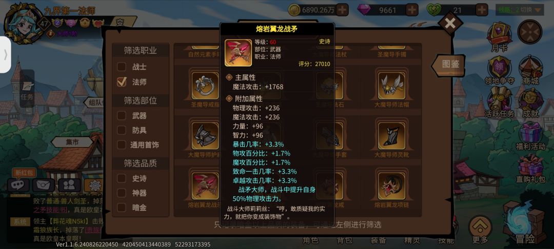 自我介绍 s1暗法苜蓿 面板如图7672法攻 小氪玩家 单50魔王16分内 运气好可以进15 诅咒触发20几率看脸! 今天聊天发现有人说法师50级下水道不敢升50 想等职业平衡。。。 或者弃游 大可不必! 虽然没玩过物理的 但一直听说50剑圣起飞 我不知道50剑圣这个面板能多少分钟打完 但我4个技能最贵的才300钻 武器首饰底价收的 今天白天魔导师职业18分钟左右 半夜睡不着调整了下 因为我是暗