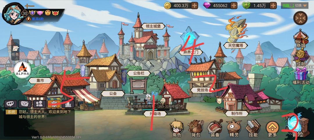 再次声明,只适合dnf新手玩家,大佬请绕道 1.第一张图为游戏界面,符号一是挂机升级的地方,建议升到十级提升境界,没试剂都一样,自己想办法获得经验药剂(快速升级的方法),符号二,我认为每天必须要打的竞技场,获得竞技点,可以在商城里面获得魔核,符号三为刷图的地方,获得装备,符号四为刷深渊的地方,获得稀有材料,神级史诗装备的地方。 符号五为游戏的核心,自由交易的地方,你可以在世界喊话或者群里寻找需要的