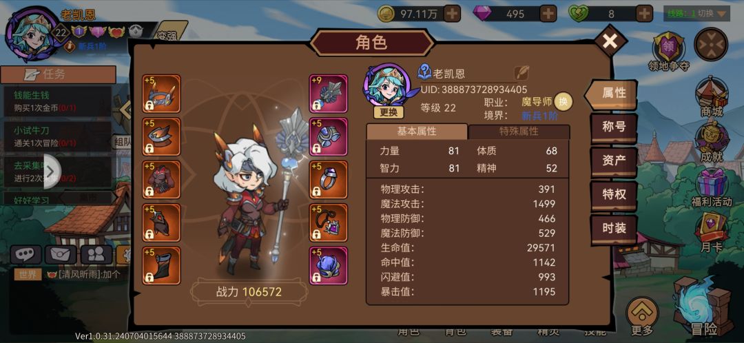 我会详细介绍游戏页面各个功能。 第一 游戏经验获取方式 主要方式 挂机获取 挂机获取经验值数量取决于你的境界等级,并且角色升级也于境界有关。10级升11级时需要提升境界,境界提升是有成功几率的可以用道具提升几率。 第二 装备获取方式 所有装备全部由冒险关卡和深渊BOSS获得,无氪金装备,良心游戏呀!点赞! 装备品质有白 蓝 紫 暗金(黄) 神器(粉)史诗(金)。史诗最低50级装备。 (深渊BOSS