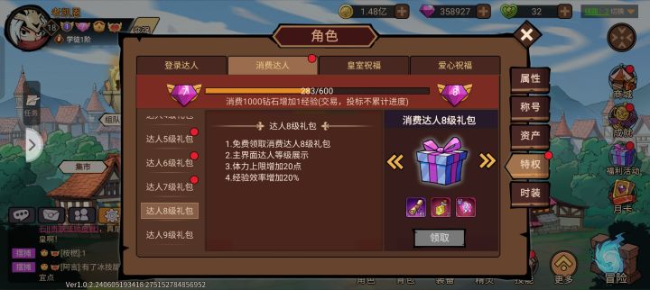 提升消费等级(就是在商城消费钻石)可以获得消费贵族vip,很需要那个经验提升,20%(贵7)也就封顶了,不用继续提升。大概150w钻石就能升满,我花多了可以提升20%修炼场挂机经验,后期升级基本上全靠挂机。正常操作是买扫荡券然后低价卖,但是太耗时间。这里我想赌一波礼包,结果还行,没亏。这里只是帮大家测试一下,不要求各位都追消费vip,毕竟测试,说不定明天就直接发经验药水了。