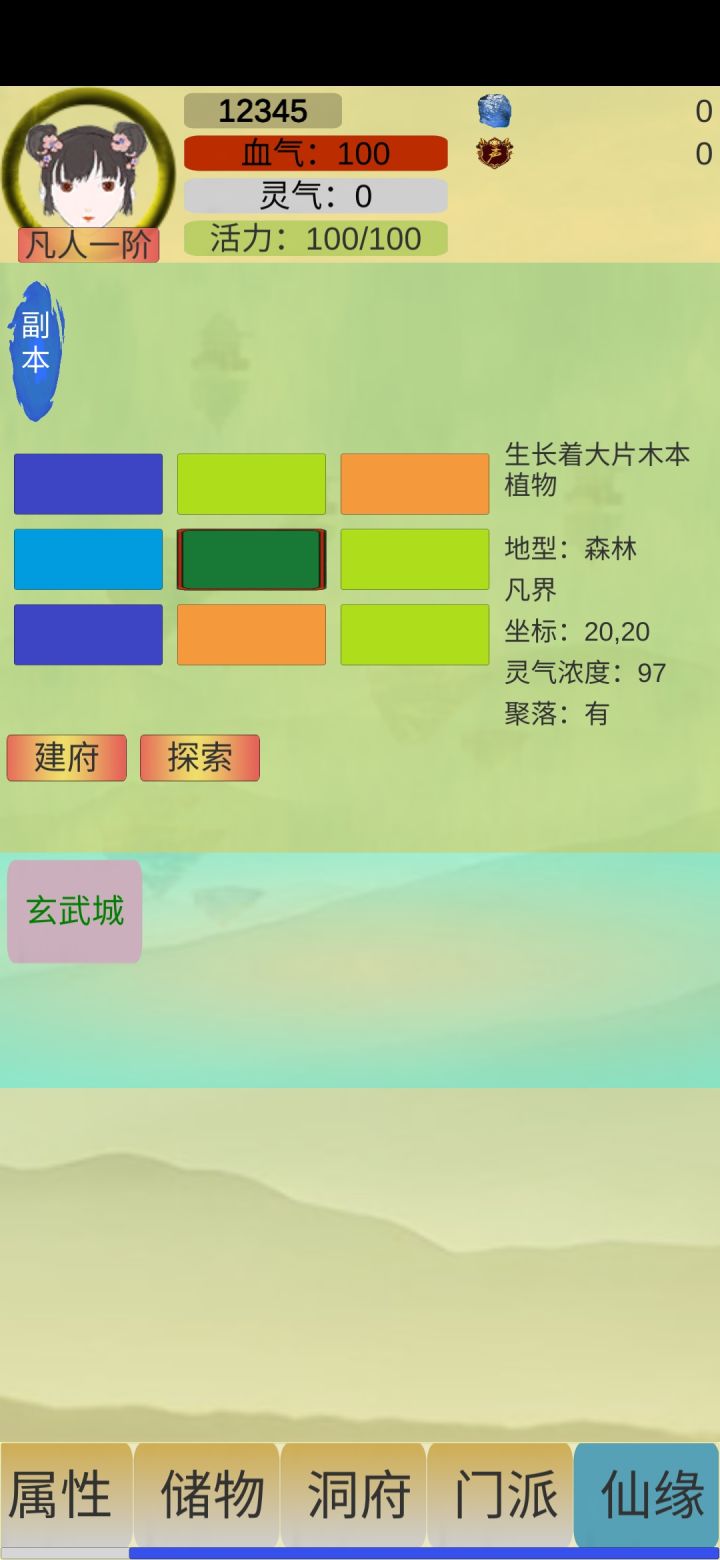 刚进入游戏,由于没有灵根。先练体提高属性。属性提高后左划底部导航栏选择仙缘。可以点击探索,获取奖励。发现灵气高于100的地方可以选择建府,提高后续灵气修炼速度。建议105以上建府。点击上面副本入口,可以进入试炼,挑战完成,可以进行化衍。试炼等级越高,化衍奖励越好。可以获得渡劫丹。试炼获得的残页在背包使用,然后可以在坐标(10.10)(10.20)(20.10)(20.20)点击主城进入主城,