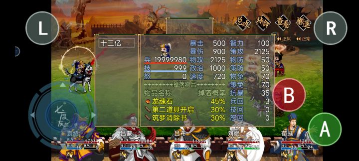 玩了一下午,看着这游戏没啥攻略,就分享一下自己的体会,刚进入游戏打完二当家,城主送的招募令(可存档sl)建议弄一个群体攻击角色,容易刷级,比如黄月英,然后再要个物理输出,我拿的关凤,直接把开局送的人物换掉了,然后就是黑风寨大当家。打前记得存档,可以掉招募令。其次主角,因为他是随机技能,所以可以多存档sl一下,刷到自己心仪的技能再出门,这游戏被动挺重要的,有个被动再动一回合挺强的,还有一个被动加暴击和暴击伤害多sl几次就知道该选啥了。还有最重要一点开宝箱(那种蓝紫装)前记得存档,多sl几次可以出词条,装备直接升一个档次。打小怪也是它显示掉绿装,但是有词条的直接就是蓝装了。阵容的话一共五个人建议一奶一物理输出一辅助一智力输出,还有一个就是主角了。辅助就是控,然后增益减益,还可以承担肉盾位置,吕蒙目前是最佳辅助开局直接控三回合,然后清掉小怪后,运气好还能控的BOSS不能自理,但他速度一定要快,不然不能实现连控。这游戏反正就得多存档自己多探索,游戏还是不错的,我觉得这类游戏还是得自己探索,不然一直按照别人的思路走也没意思,我也就分享一下我的游戏心得。