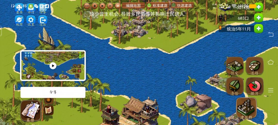 开局先开通贸易,选到偃师船队就行了,这个图我的通关策略是背靠右上角的石头山,挖石头卖,然后通过码头直接卖了。原住民那边不用管他,自有敌人帮我给他拆了,那些藏在树里面的原住民房子,帮他把树清除了就好了。农田那边的树要留着挡着敌人,后期人多了,钱多了,原住民也被消灭完了就往外扩张。