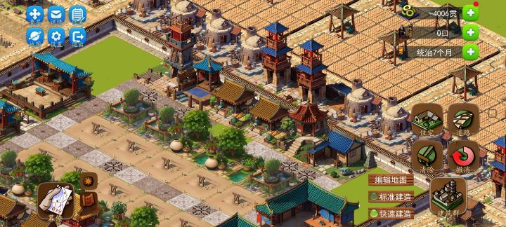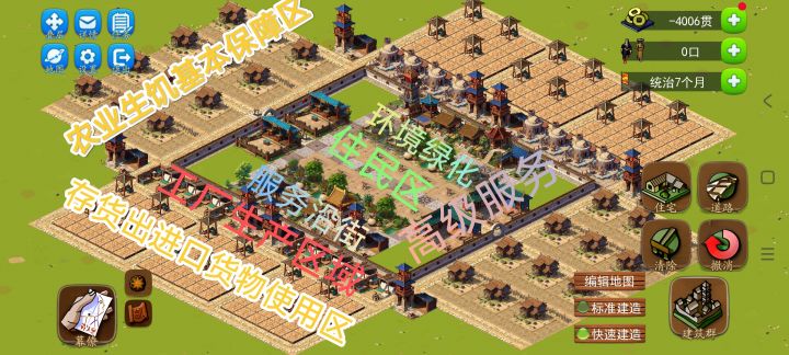 过了新手关,推荐用“郢”练手。因为“郢”建筑全开,而且没有什么天灾,大部分建筑不会着火,坍塌。相对比较简单。非常适合新手锻炼游戏熟练度布局如图所示,适用于华宅及以下房屋。这套布局微调以后可以通关所有地图。但要注意,其他地图有天灾人祸,要注意建造值更房和捕快房,防止着火,坍塌。开局首先照抄布局图,在入口处建一座房区。然后建一座兵营,就可以稳定挡住各种来犯兵种。武器建一座贸易中心,直接买。不要浪费