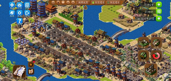 1.华宅+太师府。华宅比豪宅稳定,需要物资少,节省工坊占地;太师府留在最后冲人口和提升繁荣度。每个房区有26-28个华宅,我放了20房区+6个太师府+3个自由发挥房区2.集市、货栈。每个货栈放2种物资,这样集市一次能取两种货,房区比较稳定。3.失业人口。华宅只消耗麦、陶、纸,每个房区对应的作物8个、工坊6个就足够了,其它地方放针灸铺,见缝插针,尽可能以最小的占地消耗最多的失业人口4.钱。要么