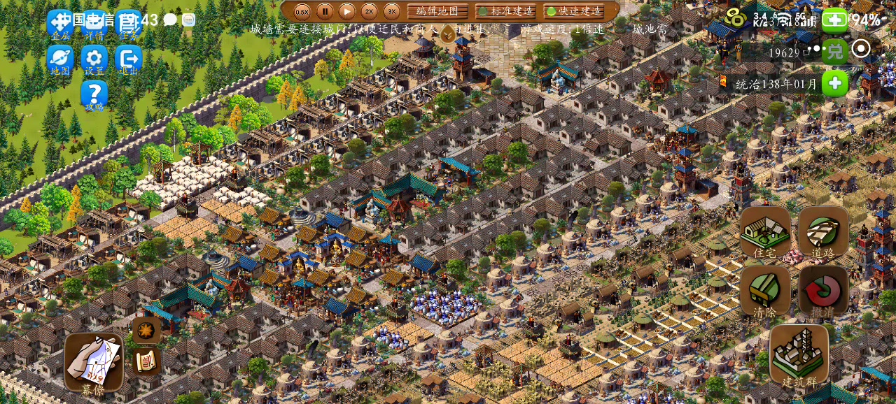 1.华宅+太师府。华宅比豪宅稳定,需要物资少,节省工坊占地;太师府留在最后冲人口和提升繁荣度。每个房区有26-28个华宅,我放了20房区+6个太师府+3个自由发挥房区2.集市、货栈。每个货栈放2种物资,这样集市一次能取两种货,房区比较稳定。3.失业人口。华宅只消耗麦、陶、纸,每个房区对应的作物8个、工坊6个就足够了,其它地方放针灸铺,见缝插针,尽可能以最小的占地消耗最多的失业人口4.钱。要么