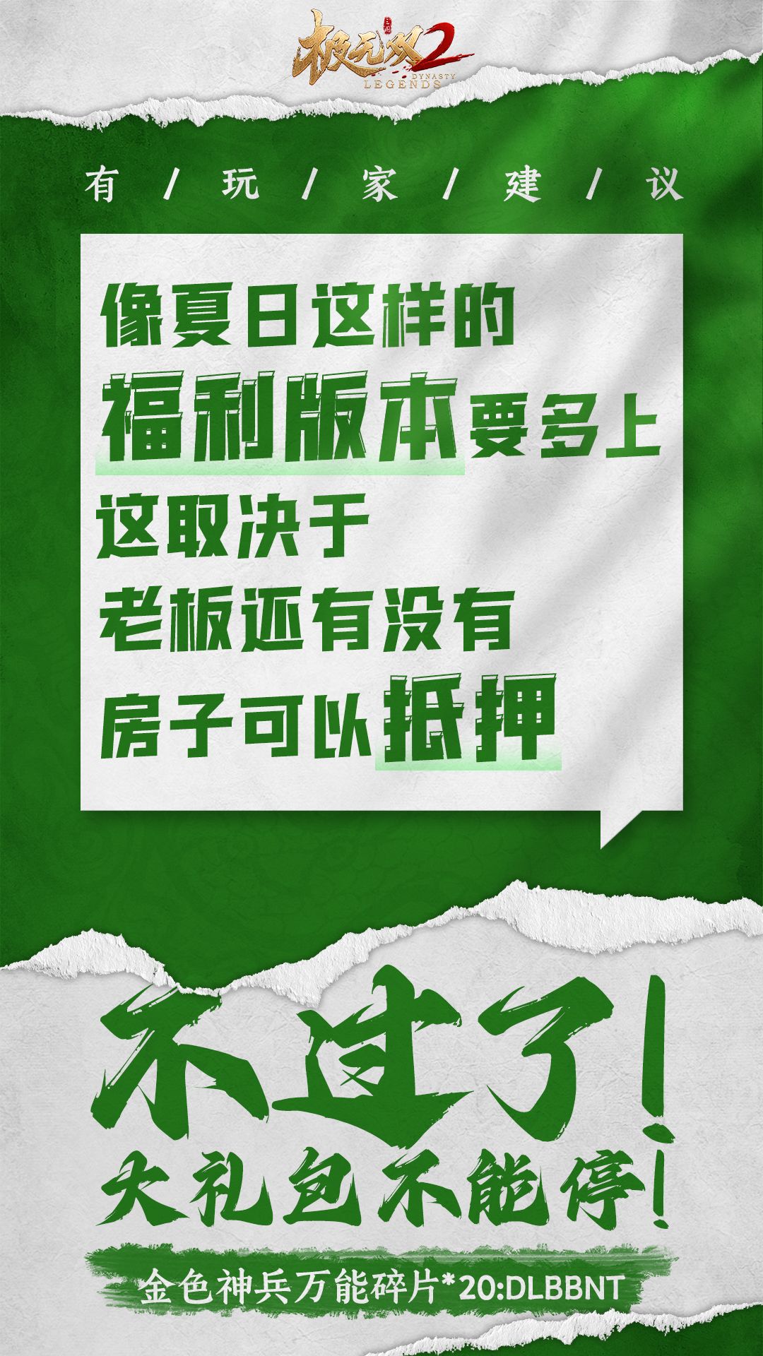 家人们,白嫖时间到! 极无双2今日游戏大礼包已发放 速上游戏兑换游戏礼包! 你白嫖我白嫖,老板明天睡天桥!