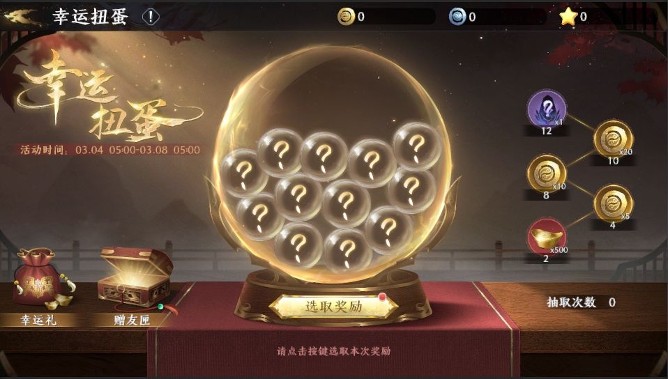 亲爱的将军: 限时活动-『幸运扭蛋』将于3月4日05:00正式开启!幸运扭蛋机隆重登场,将军可自选心仪奖励,抽取12次必得将军所选的全部奖励。坐骑外观-南蛮战象、金色品质计略、魂晶、金将碎片等好礼都在扭蛋机中等将军抽取! 〓活动时间〓 2023年3月4日 05:00-2023年3月8日 05:00 〓活动范围〓 全大区 〓活动说明〓 1.活动开启后,需选择心仪奖励作为抽取的目标奖励。奖励选定后,本