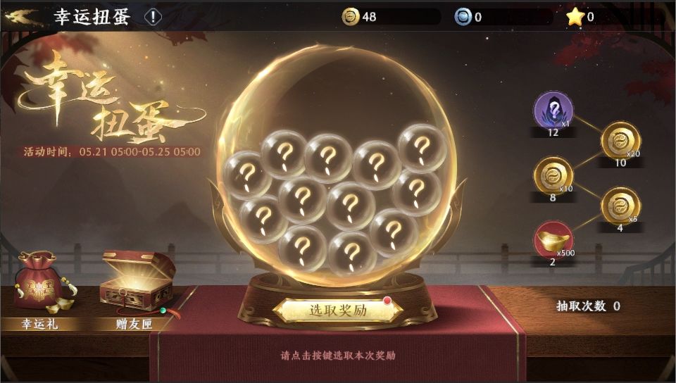 亲爱的将军: 限时活动-『幸运扭蛋』将于5月21日05:00正式开启!幸运扭蛋机隆重登场,将军可自选心仪奖励,抽取12次必得将军所选的全部奖励。环绕装饰-星语星愿、金色品质计略、魂晶、金将碎片等好礼都在扭蛋机中等将军抽取! 〓活动时间〓 2023年5月21日 05:00-2023年5月25日 05:00 〓活动范围〓 全大区 〓活动说明〓 1.活动开启后,需选择心仪奖励作为抽取的目标奖励。奖励选定