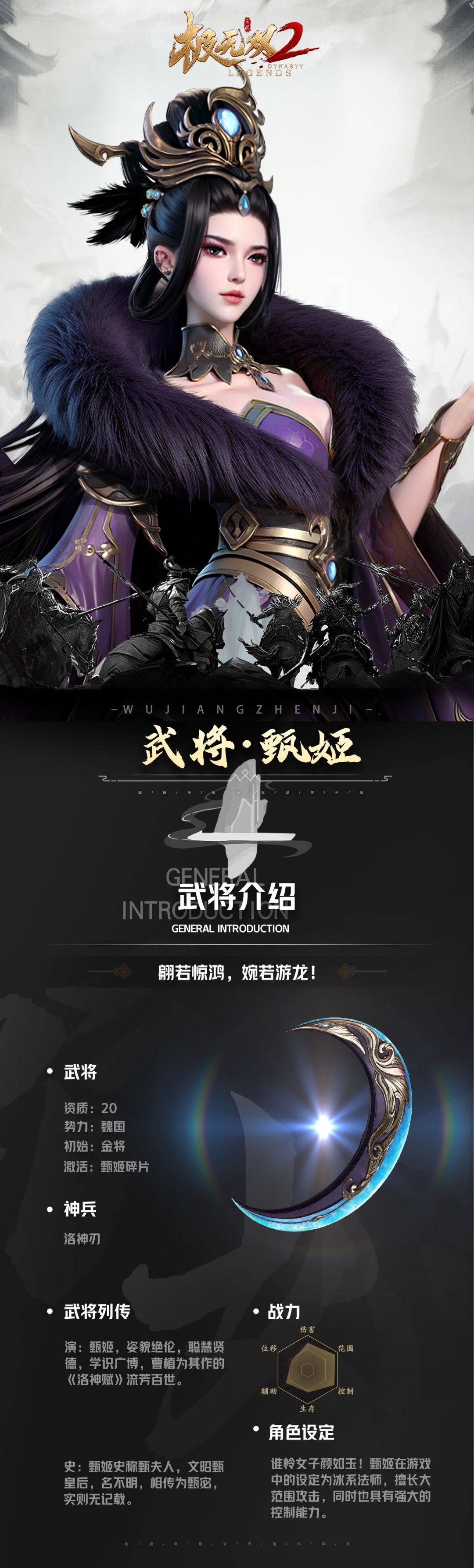 各位将军好~ 小煮最新爆料来啦,不知大家是否已经见到了,今日上的全新主将甄姬了呢? 相传甄姬懿德贤淑,仪态万方,曹植曾为其作的《洛神赋》中曾描述“仿佛兮若轻云之蔽月,飘飘兮若流风之回雪”如此经历传奇的三国名姝,她在游戏中会有什么样的设定呢?快随小煮一起来看看吧!