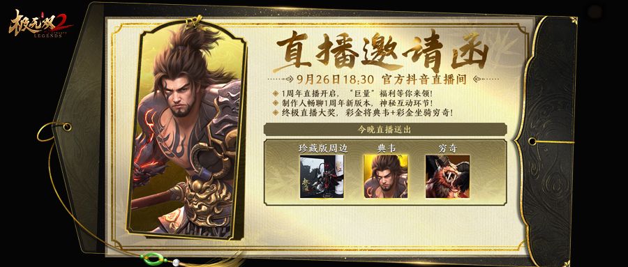 将军敬启: 《极无双2》一周年盛典直播,将于今晚 2023年9月26日 18:30正式开播! 提前预约直播地址:立即前往>>>【】<<< 一周年盛典狂欢开启,“巨量”福利降临直播间!制作人亲临现场,畅聊周年版本超多新内容:全新彩金将“典韦”前瞻体验,全新非对称国战“决胜长安”玩法介绍,周年福利活动抢先爆料……更有神秘互动环节不容错过! 更有周年终极“锦鲤”直播大奖:抽一人送出“典韦”