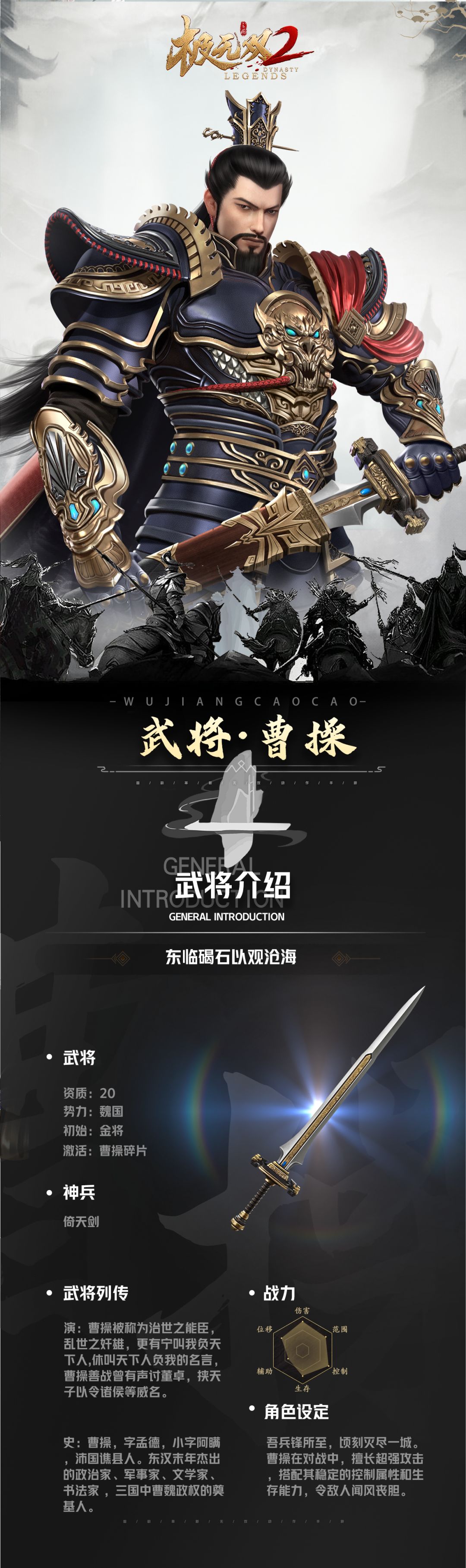 将军们晚上好呀~ 本期小煮为将军介绍的是三国中一位众说纷纭的君主,曹操! 说起曹主公,有人称他是“运筹帷幄之中,决胜千里之外”的治世之才;也有人称他是“宁可我负天下人,不可天下人负我”的一代枭雄;还有人称他是“横槊饮马观沧海”的一代文豪。可谓是三国争议第一人呢! 那在《极无双2》里,曹操这位英雄的设定究竟是怎样的呢?快来一起来看看吧! 以上就是本期的武将介绍啦,是否符合将军心中曹操的形象呢?快在评