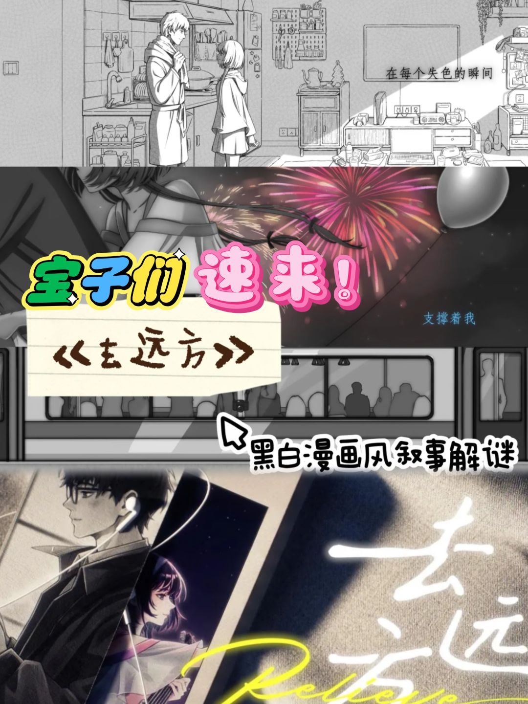首先!感谢《去远方》制作组的好游戏!! 【2024.02.20】v0.16更新后新增部分 ——以下是正文—— 1. 水杯和酒瓶点击就行 2. 争吵:分别拖动两个红色言语团回到男主、女主身体里 3. 歌曲:右侧终点往左拖回起点 4. 奔向她的位置:把云层都往右拖 5. 细心:递水杯、牵手过马路、披外套、争吵时拥抱 --- 6. 天平:把女主和电子设备分别拖到男主身边 7. 倾诉:分别拖动蓝色语言团到