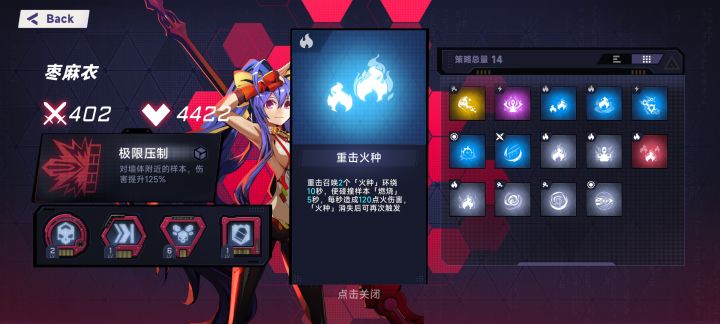 玩了十几把以后算是摸清楚了基本玩法,核心模式就是和赛马娘一样的重复培养继承模式,然后说下培养中策略的选择,以我刚打通的一把培养出的早麻衣举例:在拿策略的时候切记不要杂,并且要贴合角色特性,早麻衣近战打重击能聚怪所以拿这个重击火种效果算是不错,然后如图,一直加强火种到后面就会产生质变,依靠这个策略困难最后的boss大概10秒就打掉了,所以再说一次拿策略不要杂,同时尽量贴合角色特性 早麻衣自身技能