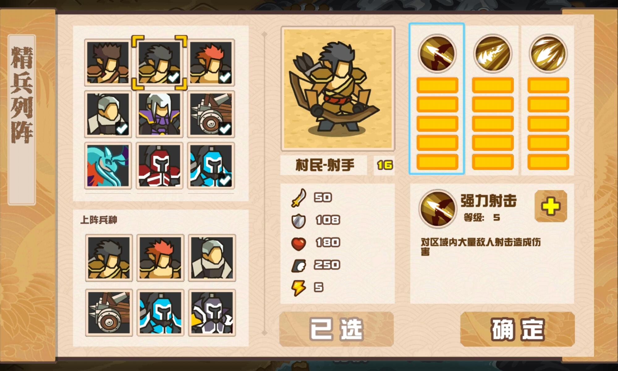 刷了几个小时升满级兵。 111前一直用最后三个高级兵种!打得挺艰辛!高级兵111过不了。不得已换基础兵,爆兵就轻松过了… 加点属性看视频前面,加点可以洗前期加点顺序:银币-金币-青玉(前期满级兵种必备,所需兵满级再洗掉就行)-恢复-攻击-生命-护甲-极速-远程 兵种优先升满级:猎户(远程+召唤猪)-炮车-巫医-刀斧手(性价比肉) 前期满级英雄免费的肉:方糖(主要作用就是风筝拉怪绕圈子)