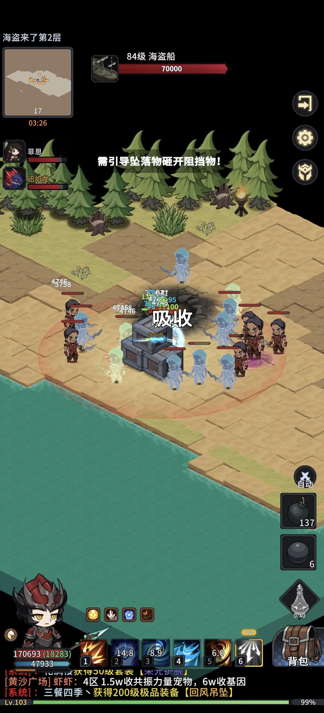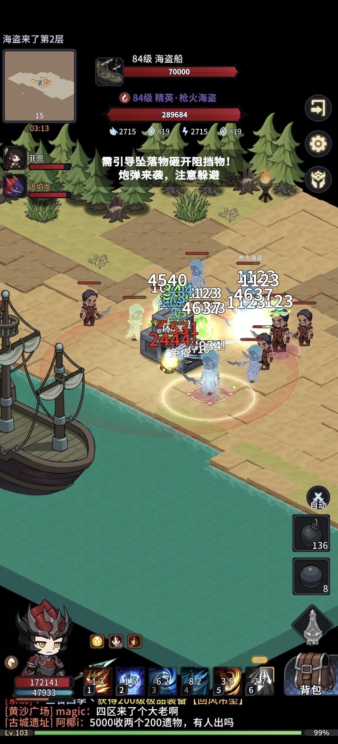 首先入场主城→右上角活动→左下角第三选项周常。 目前周常分为:海盗来了和咕噜雨,今天先分享海盗来了攻略,后续会更新后面的。 入场准备:5点体力+海盗入场卷 (每日能在商城→工坊玩具里免费获取一张) +炸弹(商城→工坊玩具里1血钻1个) 起码准备个100炸弹再入场,因为靠打怪是行不通的,里面会一直刷新海盗,你打怪的速度跟不上刷新,所以需要用炸弹清怪。 入场后重点注意⚠️右下角为炸弹选项,