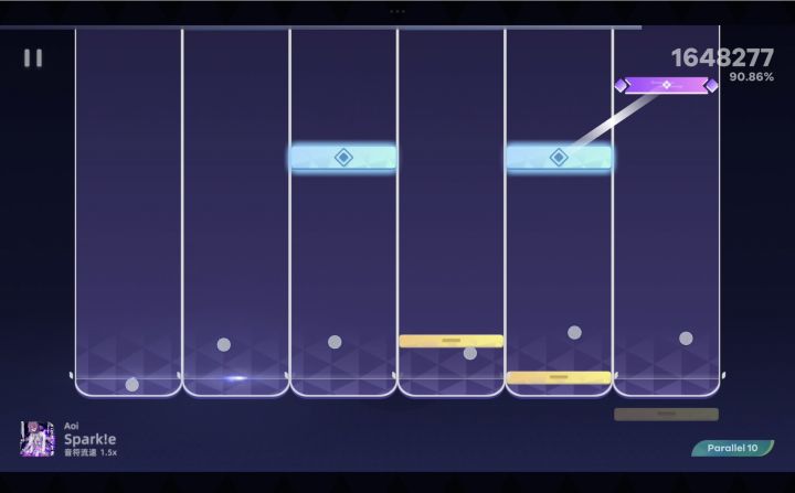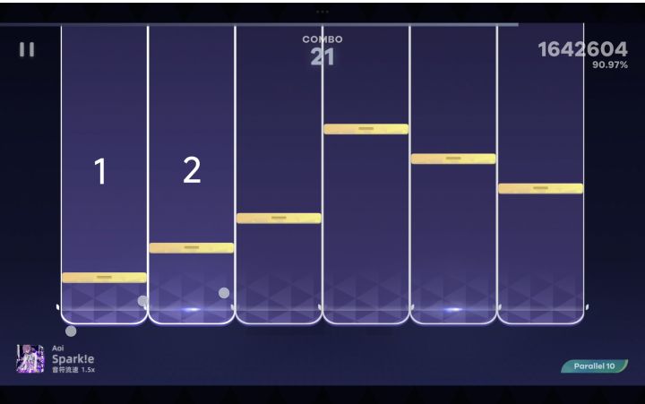 判定范围是整块轨道,也就是“判定面”,实际上还包含轨道外围的一部分区域。一次点击可以对多个判定面有效,因此落到同一点的多押可以用一根手指击中。点不到判定面内容易miss,对定位还是有要求的,喜欢糊的话很容易断,所以打的时候有种被限制的感觉,不够爽。另外,在多指的场合经常断触,比如我在糊drag的时候,只有1、2轨道亮起,其他轨道都判定失败了(如下图所示)。