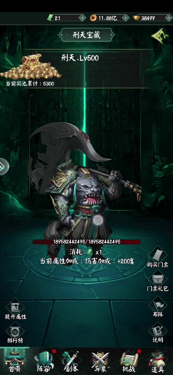 首先感谢玉叔提供的思路,近两次刑天调整了下阵容,在总战力掉了近100E的情况下秒杀了500级刑天,输出由调整之前的1400E左右(买满200%加成)提升到了稳定秒杀刑天(买150%加成)。由于玩不了多久了,趁还没撤分享下心得,也给新区大佬们提供快速毕业的思路,相信很多玩家都知道毕业刑天自然是好处多多。废话不多说了,先上图。 以下是战斗过程图以及人员配置的分享,说下核心思路。 1/多攒紫金1魂灵,频