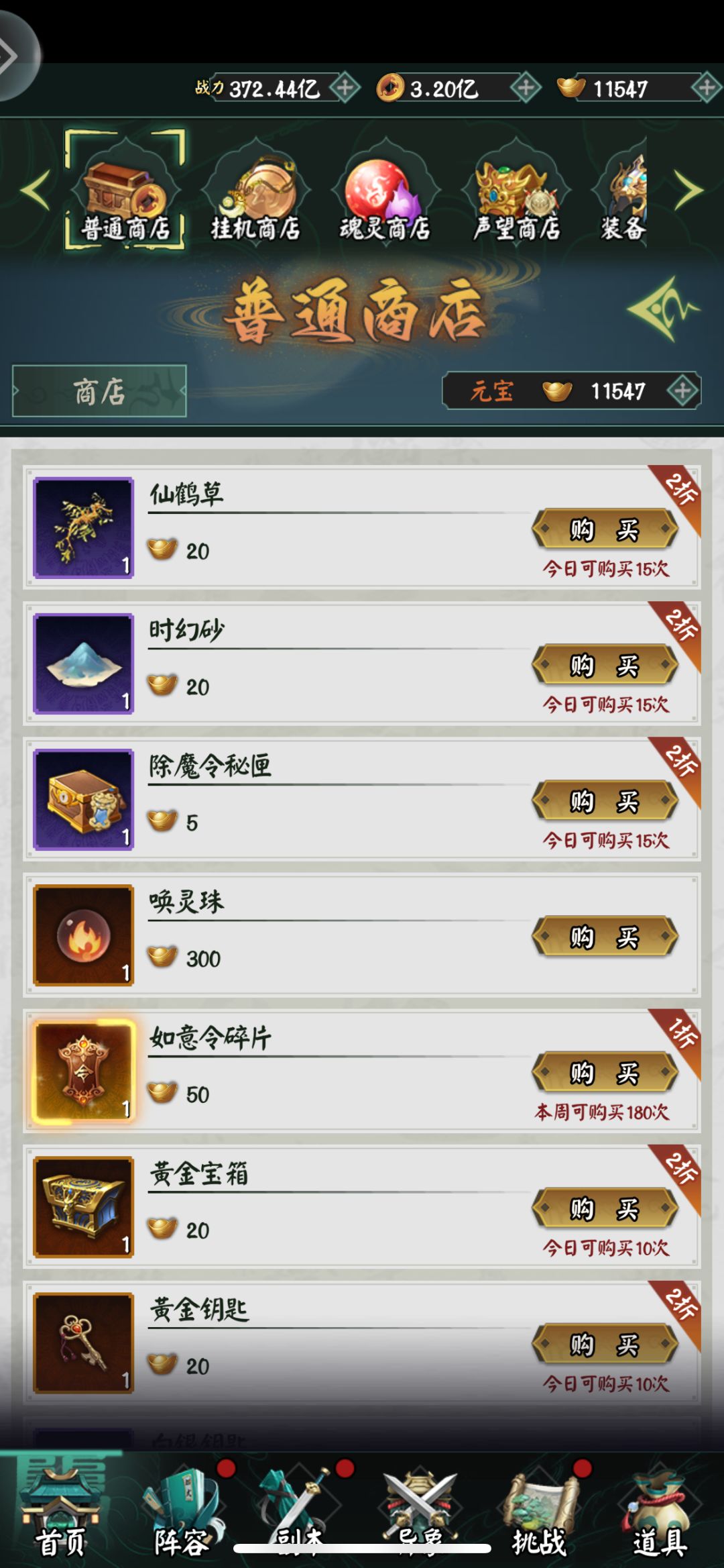 由于更新后商店中的商品和物价已经改了,之后可能还会改,也不排除出新资源的可能性,因此这篇攻略旨在分享购买资源的思维方式,以便应对之后的改版。由于商店太多,就不一一拍照了。总体的购买逻辑是:首先兼顾所有的玩法,然后尽量购买稀缺、容易瓶颈的资源。 一、普通商店 这个我觉得即使之后改版,也不会有太多新花样。仙鹤草前10次购买价格逐渐上涨,后面固定80元宝一个。我在新手攻略(第一章)中也说过,突破等级上限