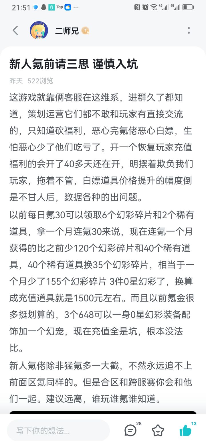 之前没搞清状况,以为之前每日30氪金送的福利是幻彩,刚才才知道只是紫金,如此在主要抨击这游戏运营乱砍福利上的事情就不再成立,错怪了运营组大家造成了误会,是我没搞清状况导致的问题误导了部分玩家,本人只有每月不彻底白嫖的行为来消除愧疚了,希望游戏越做越好,再火三年。