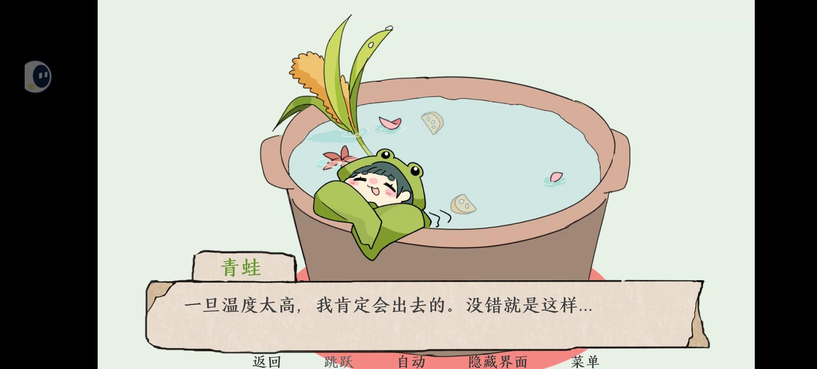 结束了,虽然这游戏很短,但也足够让我震惊了,一开始是劝说一只泡在锅里的小青蛙出来,但在和他的交谈中,发现他所说的竟和自己的如此相像,我在想我自己何曾不是一只被困在锅里的青蛙呢,不想面对现实,只想躺平摆烂,哎,但我却想拯救这只青蛙,最后谢谢机器兔子,谢谢这个游戏给我带来的治愈#游戏推荐 #游戏讨论