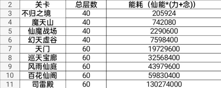 注:关卡能耗÷(宗门总仙力+总仙念)=闯过整个关卡需要多少仙能(数据转载自官方Q群的群文件)