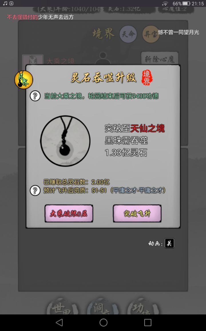 一个7000w功德,11w年,没怎么肝,只是收菜,偶尔不上线。一个2亿功德,8w多年,曾经巨肝,现在偶尔收菜。我的建议是 老玩家不能免广告太劝退!尤其是经常玩,习惯性的点那个灵石,结果还是看广告,什么都看广告,以前充值的月卡永久月卡失效了。对于老玩家来言,不能免广告太劝退,可以适当把仙界凡界广告给老玩家优化一下。